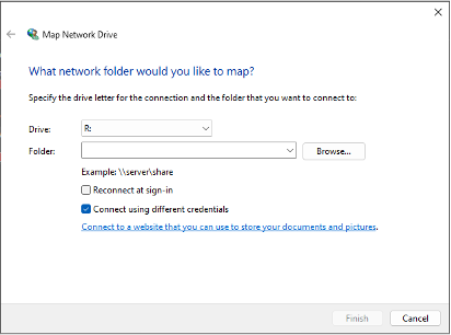 - In this new window, type “\\raptor.kent.ac.uk\exports” in the Folder prompt, then check the “Connect using different credentials” box if it hasn’t already been.