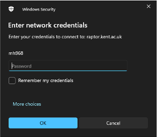 - Now you should be able to enter a custom username, enter your Kent ID (with the “@kent.ac.uk” part) and password, then press OK.