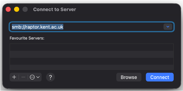 - In the new “Connect to Server” window, type in the text prompt “smb://raptor.kent.ac.uk/exports” and click connect.
