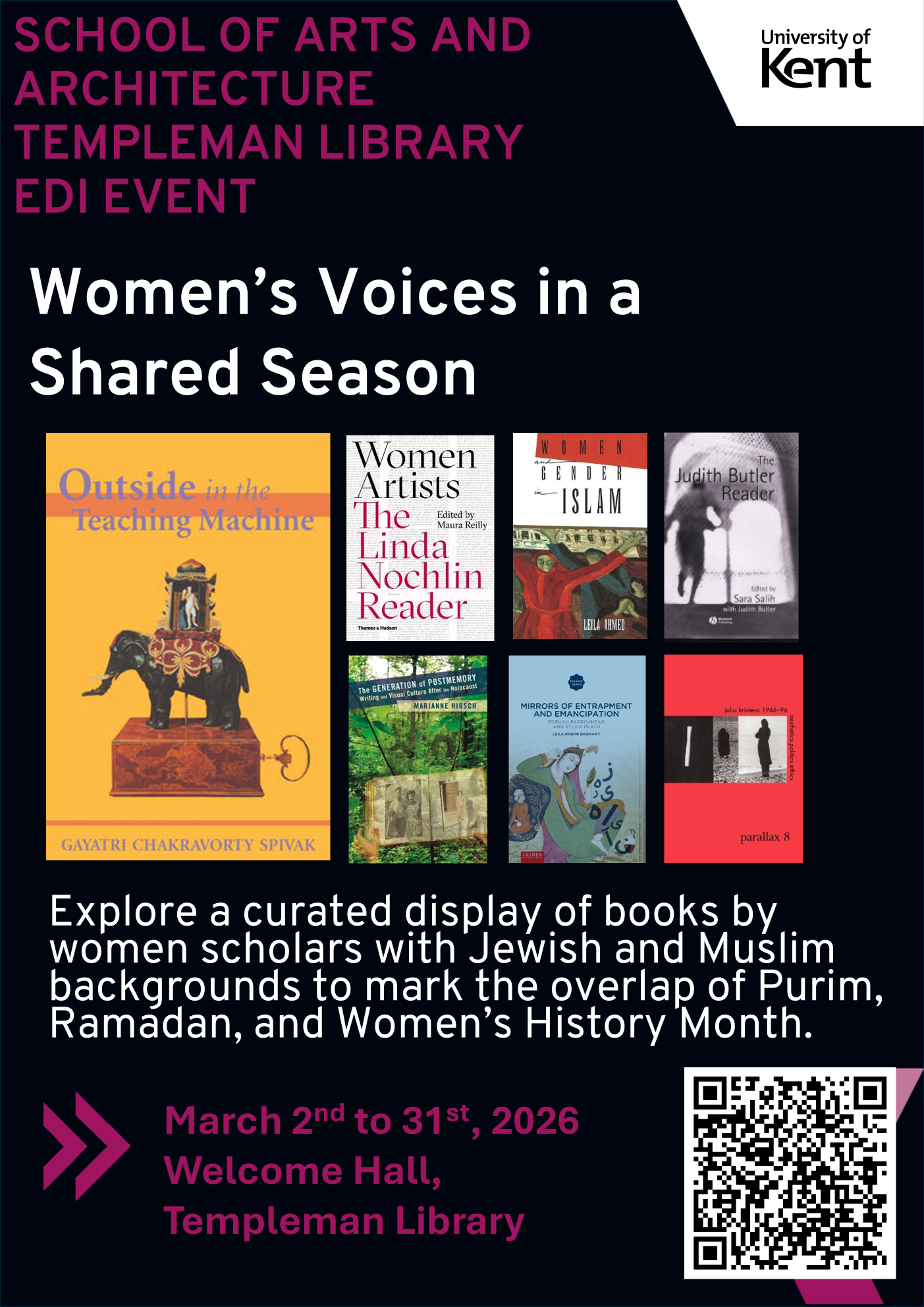 This March, the School of Arts and Architecture and the Templeman Library mark the overlap of Purim, Ramadan, and Women’s History Month with a curated display of books by women scholars, writers, and thinkers with Jewish and Muslim backgrounds, working across the arts, humanities, and architecture.